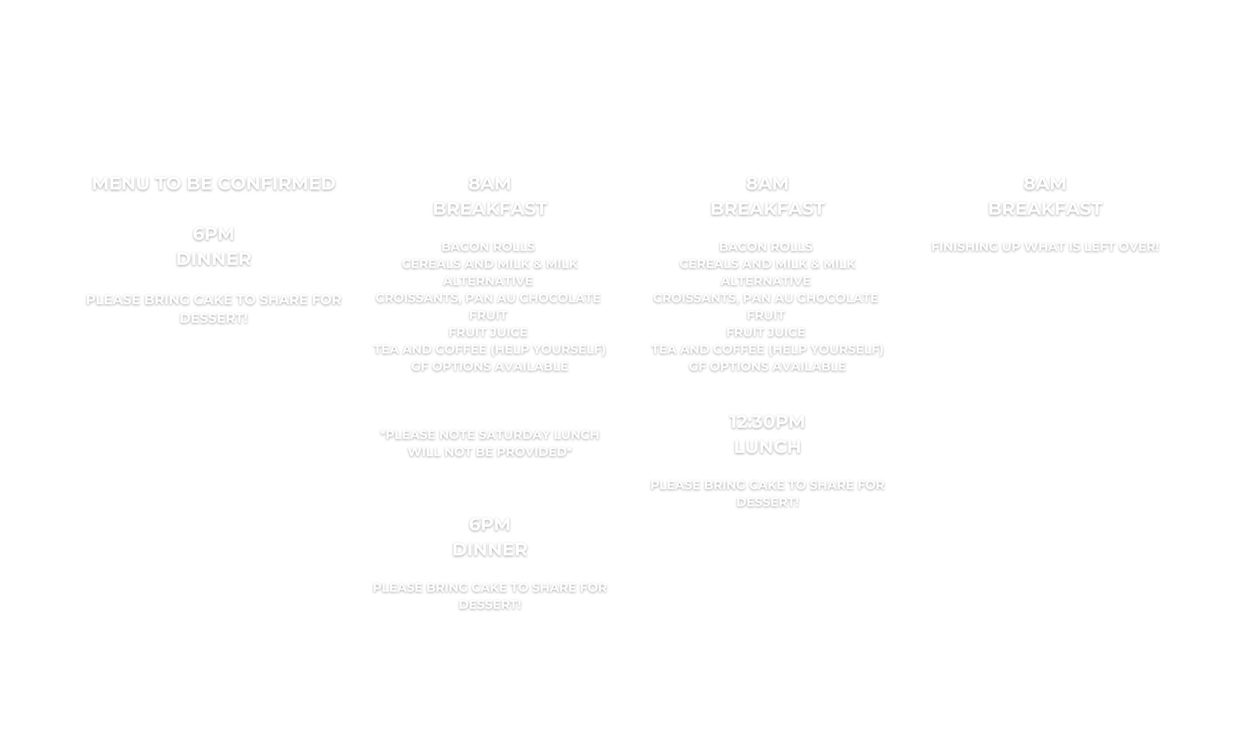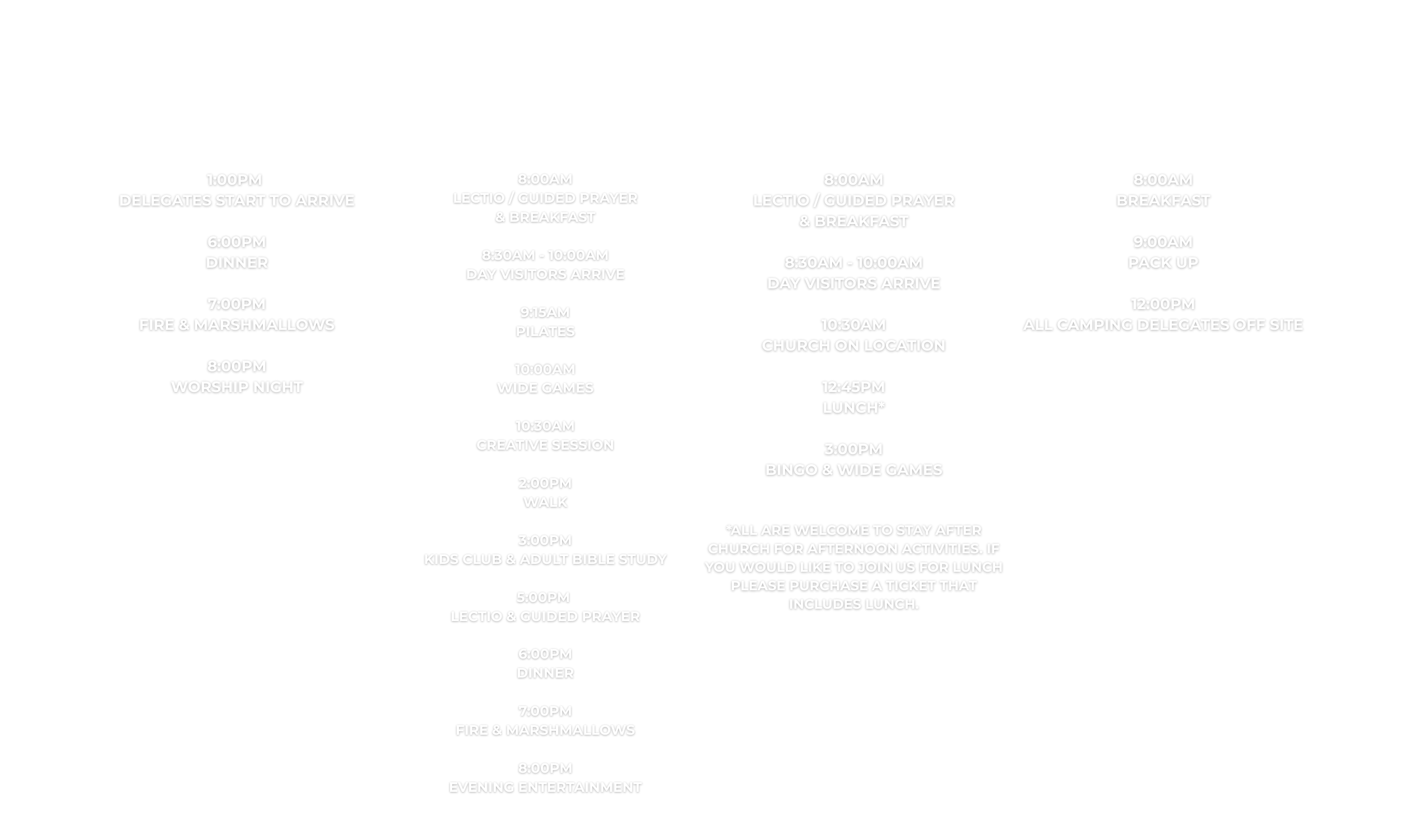This weekend aims to give you space to connect with new and old friends as well as Jesus. There will be different events throughout the days to take part in if you choose to, please see itinerary below (subject to change) for an idea of what is happening! We’d love for you to join us.